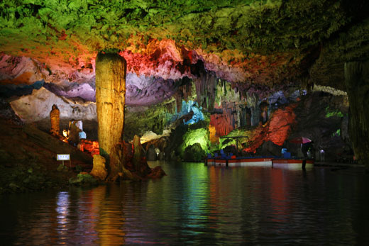 伴隨著小型瀑布的落水聲,步入洞內(nèi),光線迅速變暗。等瞳孔適應(yīng)了洞內(nèi)的亮度后,眾人的注意力隨即被周身的自然奇觀奪走,親身體驗(yàn)到“別有洞天”的真意。大家或乘船觀光,或乘小火車游覽,或步行,闖過九關(guān)正陽關(guān)、龍門關(guān)、山門關(guān)、喉門關(guān)、旋門關(guān)、金山關(guān)、重門關(guān)、金剛關(guān)、朝陽關(guān)。游完全程5180米,花去約兩小時(shí),雖然饑腸蠕蠕,卻拋之腦后。