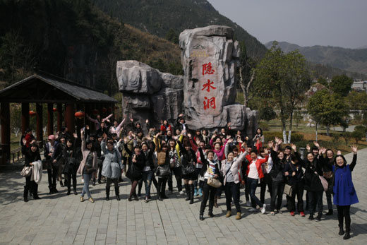 緊接著是拜訪咸寧福星城。營銷中心大門外再次拉出現(xiàn)了“巾幗靚秀”字樣的橫幅,項(xiàng)目部的同胞們?cè)缫压Ш蛟诖恕4蠹液喍痰貐⒂^了營銷中心,并在門口合影留念,隨即啟程前往隱水洞。