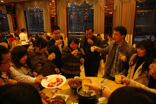 晚餐在咸寧的四星級(jí)酒店祿神大酒店。晚餐非常豐盛,魚肉、蔬菜、水果、甜點(diǎn)等應(yīng)有盡有。這時(shí)大家精神放松,談笑風(fēng)生,不亦樂乎,情緒與體溫一同上升。咸寧福星城的朱總等盡地主之誼,熱情陪同。而女士們則比午餐多了一些文雅與從容,細(xì)細(xì)品味佳肴。開心則胃口大開,對(duì)女士們來說,吃不完的美食、飲不盡的酒水,難道不就是最貼心的節(jié)日犒賞嗎?
