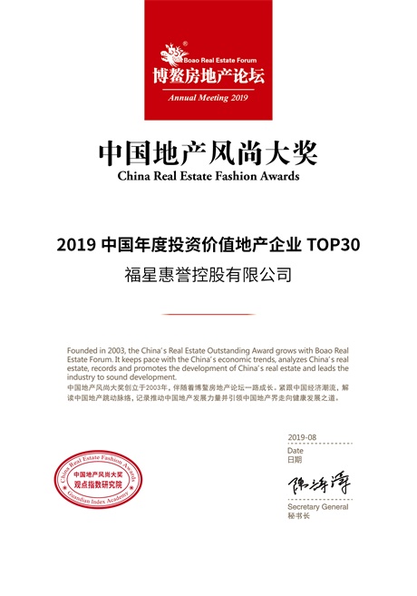 8月7日于海南舉行的“2019博鰲房地產論壇”現場,觀點指數研究院重磅發布了“2019中國地產風尚大獎”,福星惠譽控股有限公司憑借在過去一年的努力和業績,入選“2019中國地產風尚大獎”2019中國年度投資價值地產企業TOP30。